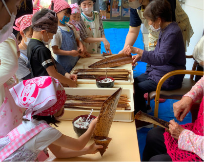 事前に、ちまき練習コーナーを設け、紐の結び方を遊びながら学びます。当日は、隣接する高齢者施設の利用者さんと共にちまきづくり。出来立てをみんなで味わって、自然と笑顔が広がります。