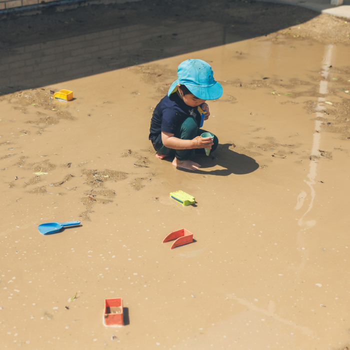 園庭は2つ。第一園庭には遊具や砂場があり、昔ながらの手押しポンプが人気です。泥んこ遊びや花を使った色水遊び、木の葉拾い、畑での虫探しなど、園内外で思いっきり自然とふれあいます。第二園庭はサッカーや鬼ごっこなどの集団遊びができる場です。こども達は遊ぶ園庭を自分で選びます。
