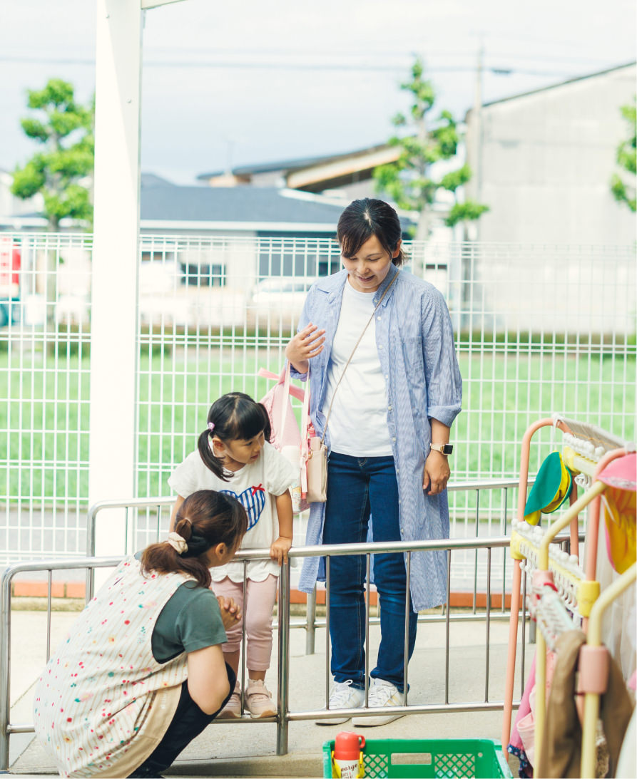 「おはよう!」と元気に登園。先生や保護者と笑顔で挨拶を交わします。