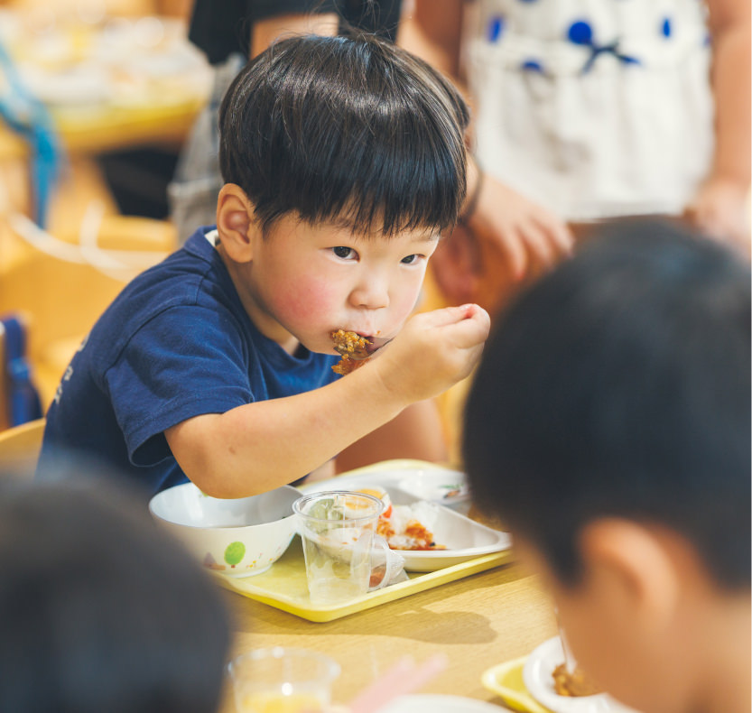 みんなで園内調理の給食をいただきます!3歳からはセミバイキング形式。自分で量を選んで食べます。