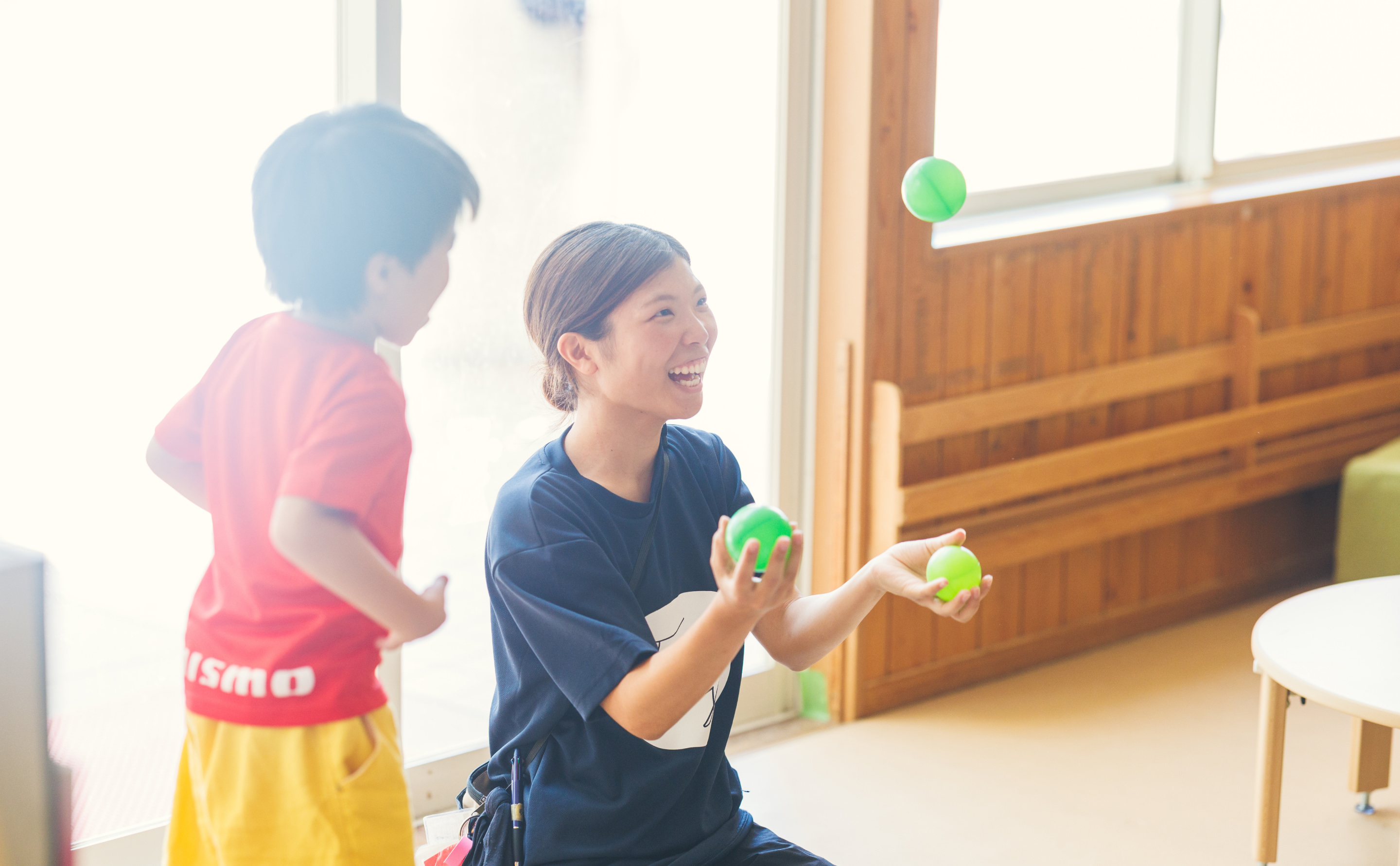 百々香先生(以下、百): はい、そうなんです。こどもが好きで仕方なくて、それで保育士になろうと思った時に、今度は自分がこども達にハートを伝えたい!と思いまして、帰ってきました!
